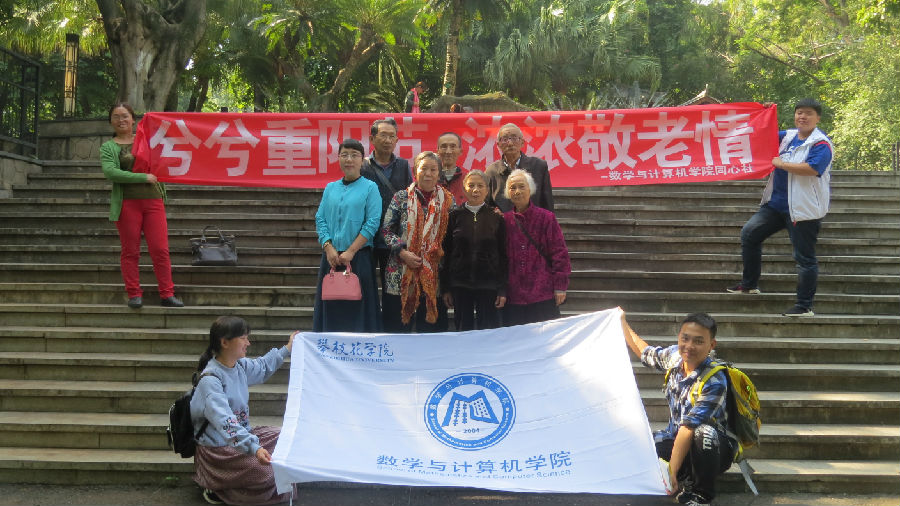 2017年10月29日上午,数计学院举办了主题为“兮兮重阳节,浓浓敬老情”的健步爬山行与座谈会,学院党委书记谭千蓉老师,分团委书记刘亚尼老师,我院在攀退休老教师以及部分同心社志愿者参与了本次活动。
