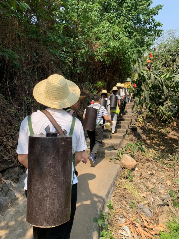 在背水小道进行了体验,背水负重前行1.5公里,体验三线建设初期,在新鲜蔬菜匮乏、缺少饮用水的艰苦环境下,攀枝花第一代建设者如何通过开荒种地、背水上山,制作了干打垒亲身体验了三线建设时期的艰辛与不易。通过“共做创业饭”,学习当年三线建设者在工地旁、山坡上烧热菜、煮热饭,席地而坐,一顿简餐过后,再次感受其艰辛。