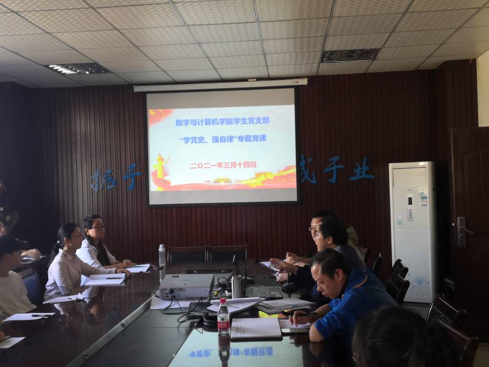 2021年是中国共产党成立100周年,是小康社会全面建成之年,是“十四五”开新局之年。为深入学习贯彻落实习近平新时代中国特色社会主义思想,开展“好党史,强自律”学习教育,总结历史经验、认识历史规律、掌握历史主动。年3月14日上午9:00,数学与计算机学院组织学生党支部开展了“学党史,强自律”专题党课暨动员大会。