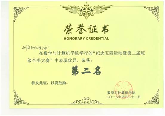 工作方面,他在2017-2018学年担任数学与计算机学院同心社干事并获得“优秀干事”荣誉称号;2017年至今担任2017级软件工程四班团支书并获得校级“优秀团干部”荣誉称号。作为班委的他,“身在其位,履其职,担其任”,努力为班级争取荣誉,他所属班级取得以下成就:校级“5.25心理健康节之心理主题班会”优秀奖、数学与计算机学院“纪念五四运动暨第二届班级合唱大赛”二等奖、数学与计算机学院班级风采大赛三等奖。