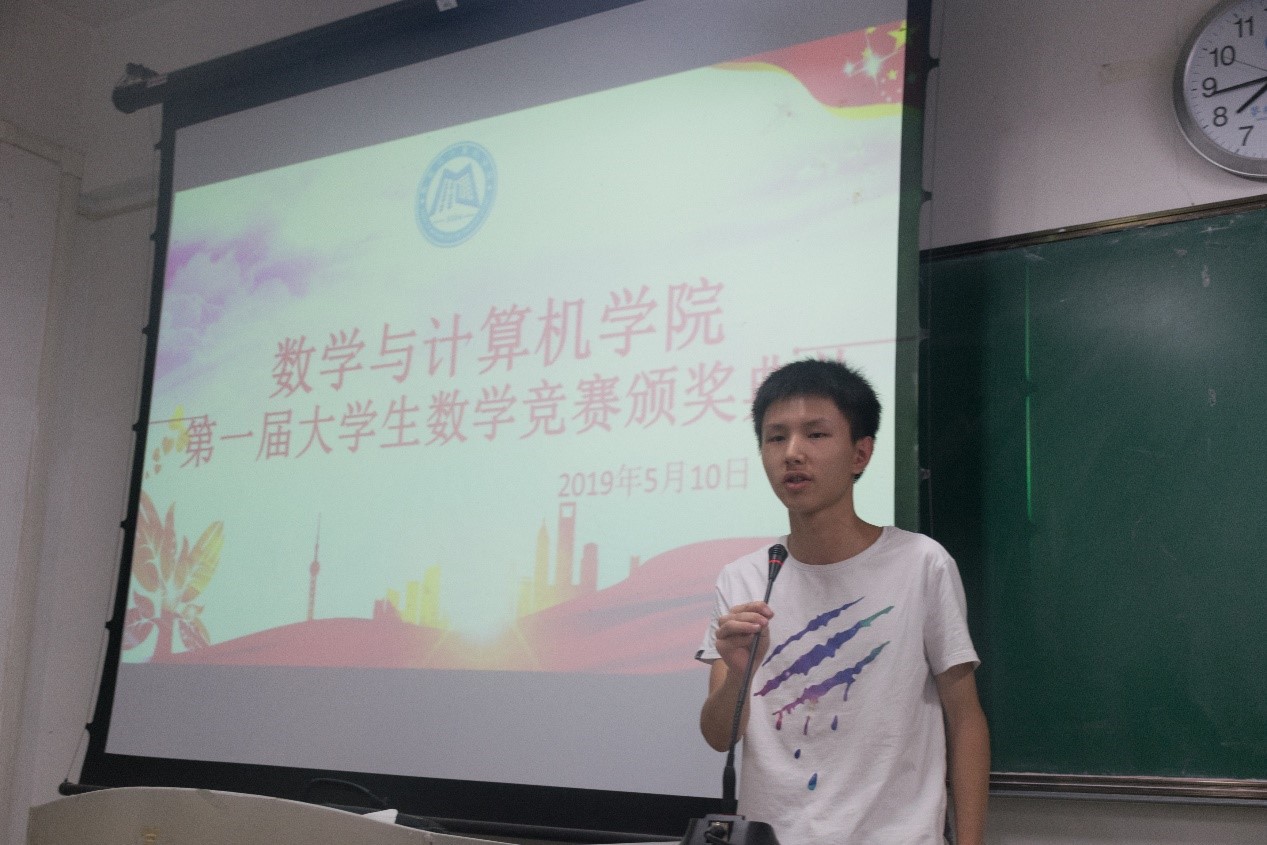 本报讯(任启祥报导)5月10日晚上7:30,数学与计算机学院第一届大学生数学竞赛颁奖典礼在二教2-211室正式开始,数计学院党委副书记林宗兵,学生科科长程江珂,分团委书记朱华,2018级辅导员龚萍担当本次大赛颁奖嘉宾。获奖的同学们积极参与本次颁奖。