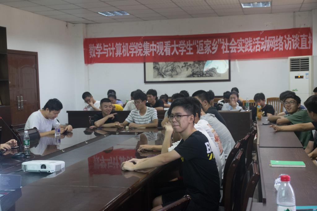 本报讯(黎婷 报导)6月28日上午10:00,数学与计算机学院在本部砺志楼四楼会议室组织学生观看大学生“返家乡”社会实践活动网络访谈直播。