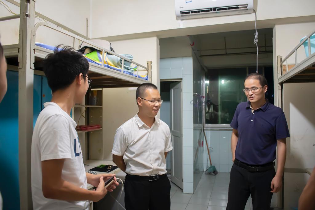 本报讯(黄铮 报道)9月6日晚上20:40,数学与计算机学院党委副书记林宗兵、院长助理罗学刚、数计学院2019级辅导员刘亚尼携学生会主席陈益锋、蒋璐先、韩杰满、赵丽以及2019级年级助理朱守平一同走访数计学院新生寝室。