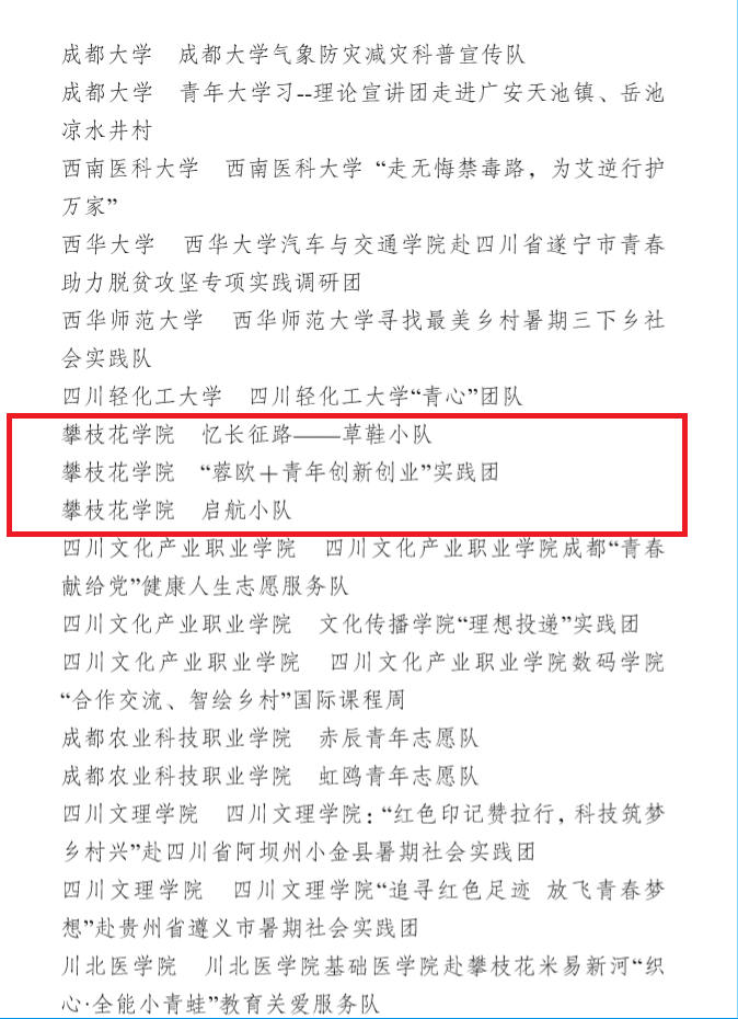 本报讯(黎婷 报道)近日,由团中央学校部、团中央网络影视中心、中国青年网联合开展的2019年全国大中专学生“三下乡”暑期社会实践“镜头中的三下乡”、“千校千项”社会实践活动成果遴选活动中,我校一共有1项集体和8项团队或个人获奖,其中数计学院有5项团体或个人。我院叶珊、朱华老师带领的“忆长征路——“草鞋小分队”朱华、叶珊老师带领“启航小队”入选“千校千项”优秀团队案例;我院程江珂、朱华、叶珊老师带领的“文化传承-薪火小队”在“镜头中的三下乡”成果遴选活动中获“优秀视频奖”;我院教师程江珂获“2019年全国“三下乡”暑期社会实践优秀指导老师”称号,我院“文化传承-薪火小队”队长蒋璐先(本届学生会副主席)同学获“2019年全国“三下乡”暑期社会实践优秀通讯员”称号。