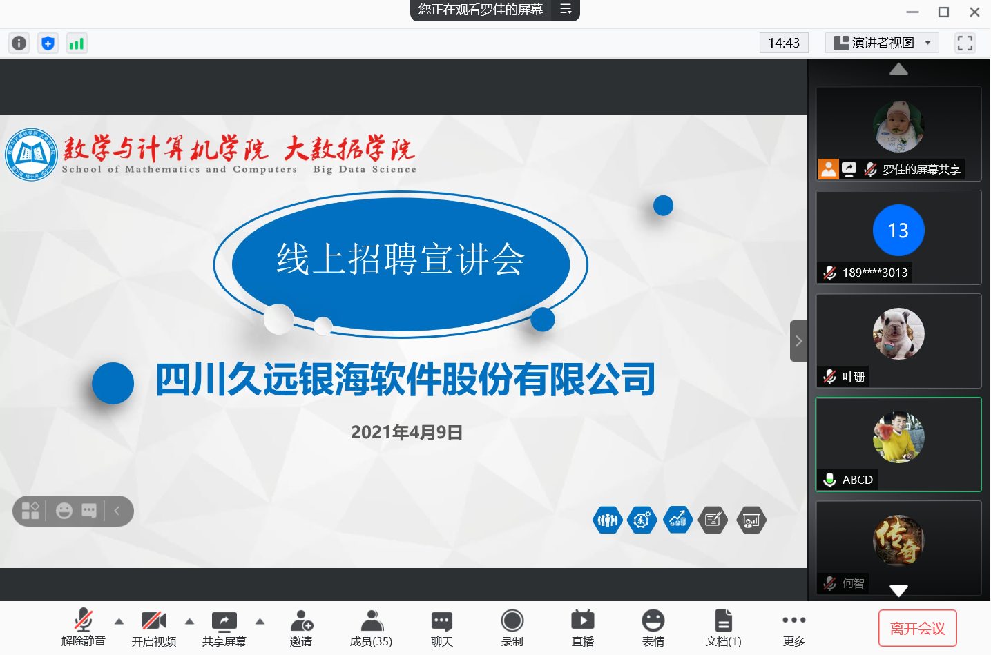 本报讯(任湘 报道)4月10日晚,我院通过线上平台召开2017级招聘宣讲会。参加此次会议的人员有四川久远银海软件股份有限公司经理唐锐,2017级年级辅导员罗佳、叶珊,2017级年纪助理姚晟恺,以及2017级全体成员。本次会议由姚晟恺主持。