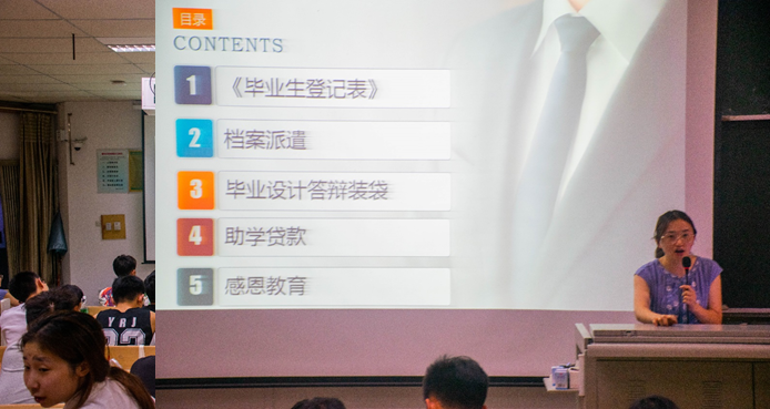安排会伊始,她向毕业生们讲解毕业生登记表的制作和填写应当认真、一丝不苟;强调档案需要放入档案袋中以及其他的基本信息要确认清楚,保证正确无误的填写好毕业的相关文件。对于有着助学贷款还未还清的同学,需要在毕业之前及时还清贷款。她反复强调仍没有获得计算机二级证书的同学,一定要去参加学院的计算机考试,不要让其成为毕业生毕业的一道坎。最后,罗佳向毕业生们说明在毕业答辩之后需要将毕业相关表单打印出来,让指导老师签字。