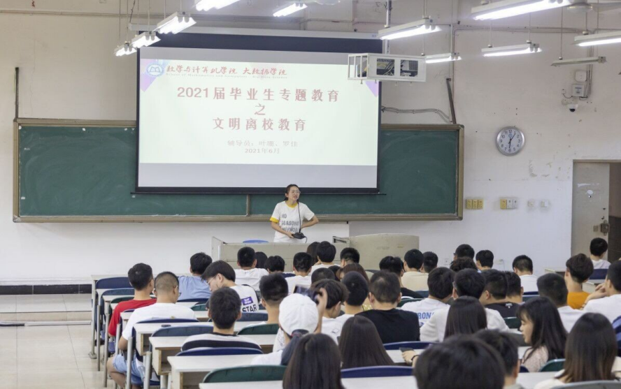 本报讯 (任雨 报道) 为确保毕业生顺利就业和文明安全离校,数学与计算机学院于6月18号在二教2-101召开了“文明离校”主题教育活动。参加会议的有2017级辅导员罗佳、叶珊,以及2017级全体学生,由罗佳担任此次会议的主持人。