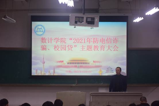 本报讯(张铎龄 报道)为提高同学们对不良校园贷和电信诈骗的防范意识,11月26日,数学与计算机学院(大数据学院)于二教2-4开展“远离不良校园贷,谨防电信诈骗”专题教育活动,参加人员有学生科科长邓勇军,数计学院2021级全体同学。本次活动由邓勇军担任主讲人。