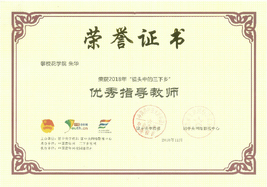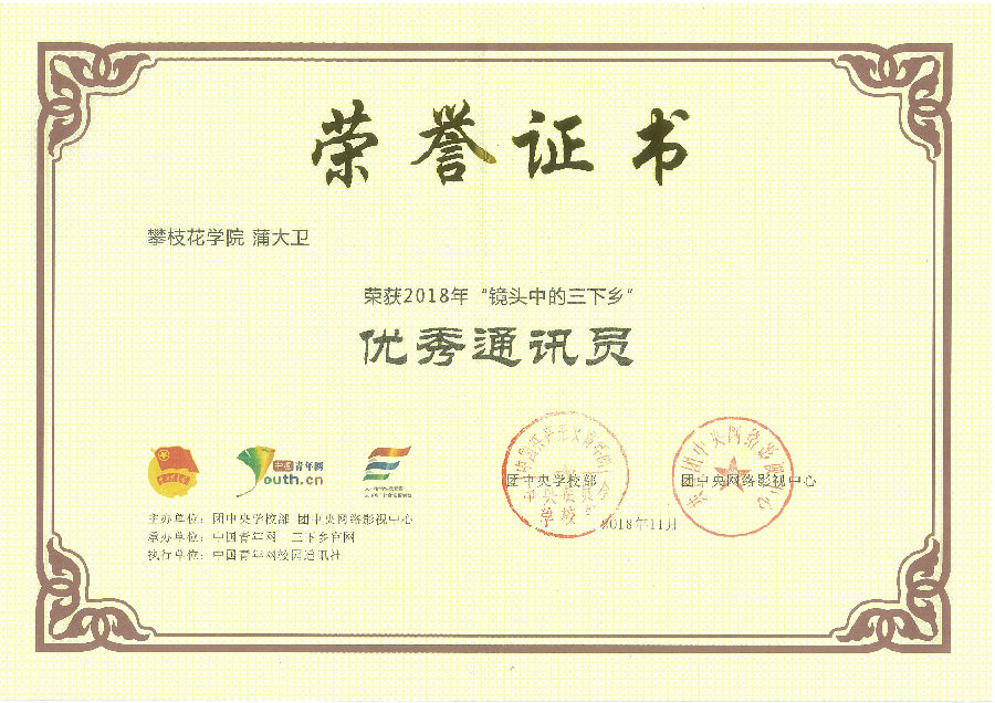 本报讯(周建国报导)2018年11月19日,由团中央学校部、团中央网络影视中心、中国青年网联合开展的2018年全国大中专学生“三下乡”暑期社会实践“镜头中的三下乡”活动获奖名单出炉,在数以万计的优秀作品与参加人员中,共评选出了200个优秀报道奖、200个优秀摄影奖、200个优秀视频奖、200名优秀指导教师、200名优秀通讯员。其中,数学与计算机学院程江珂与朱华老师带领的“槚道”团队制作的视频荣获“优秀视频奖”荣誉称号;数计学院分团委书记朱华荣获“优秀指导老师”荣誉称号;数计学院团委学生会主席蒲大卫荣获“优秀通讯员”荣誉称号。
