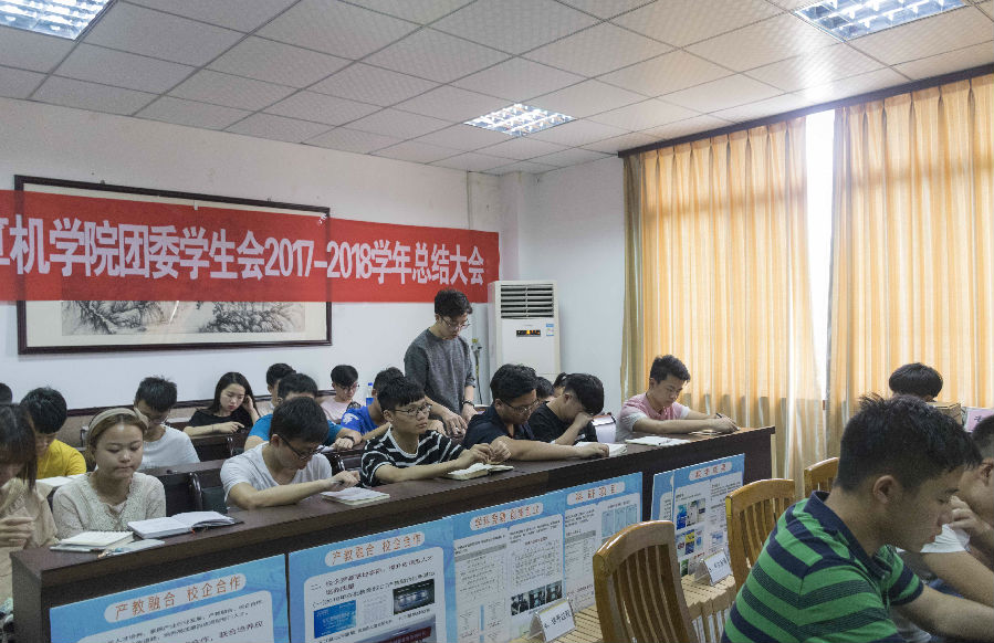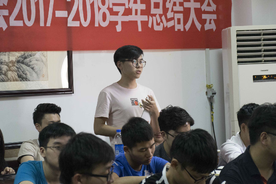 会议伊始纪检部部长进行人员点到。随后由各部门总结2017-2018年的工作。其中比较深刻的是新闻中心主任向政宇,他对部门进行比较全面的总结,依次从一年的工作动态、干事培训、工作不足等多个方面进行说明。还有值得一提的心理部部长唐杨,对于一学期的心理活动进行说明并对各年级各班心理班会进行梳理,还有对接下来的“5.25心理系列活动”表示充满信心。随后在各社团的总结之中,计算机应用协会获得校二星级社团荣誉,同心社也得到了分管主席和刘亚尼老师的高度赞扬。接着各部门分管主席进行工作总结,各位主席表示他们在认真完成工作的同时也充分认识到了自身不足,并希望下届主席能改善工作瑕疵。数计学院分团委学生会主席冯政鑫进行了以下总结:
