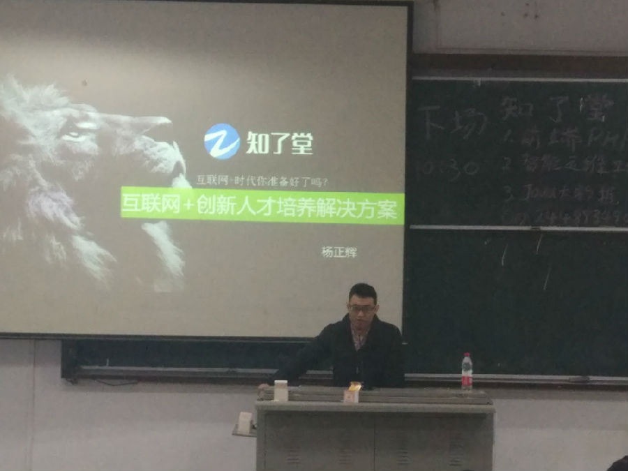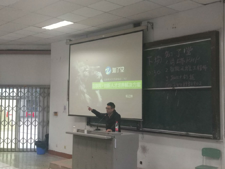 先杨正辉总监为15级学子介绍了知了堂并做了简单的自我介绍。然后他把内容分为三点来讲,一是前端PHP;二是智能运维工程师;三是Java大数据。他提出“互联网+”正在渗透各行各业,带来了大量的IT创新人才,同学们应该把握眼前的时机。接下来他给出了知了堂解决就业的三个方案:Java+大数据工程师;前端+PHP工程师;智能运维工程师。最后杨正辉总监给15级学子留下八个字:学习实践,社交就业。并鼓励同学们努力学习专业知识,全面提升综合素质。