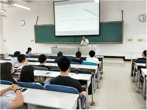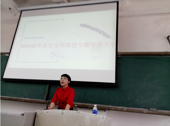 数学与计算机学院于2018年5月24日下午在第二教学楼2-1举行了2018届毕业生文明离校专题大会,出息本次大会的有党委书记谭千蓉、党委副书记林宗兵、辅导员老师田静和2018届毕业生240余名同学。大会由谭千蓉书记做关于毕业生文明离校主题教育讲话,内容包括: