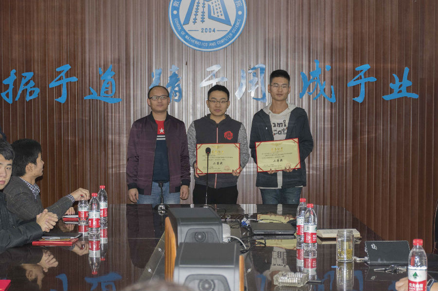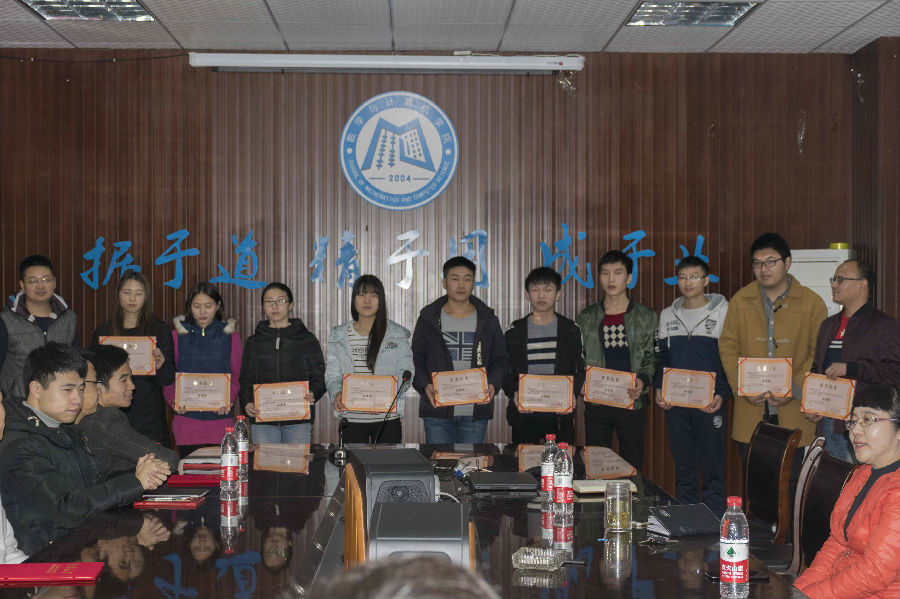 本报讯(钟琳敏 冯泉报道)2017年12月27日中午12时50分,数学与计算机学院寝室文化节、学风建设之“开心辞典”活动、校内蓝桥杯选拔赛颁奖典礼于励志楼四楼会议室举行,与会人员有数计学院党委书记谭千蓉、学生科科长方青松、办公室主任罗淼及团委学生会主席团成员,主持人欧亚。一同到会的还有各项活动的获奖人员。