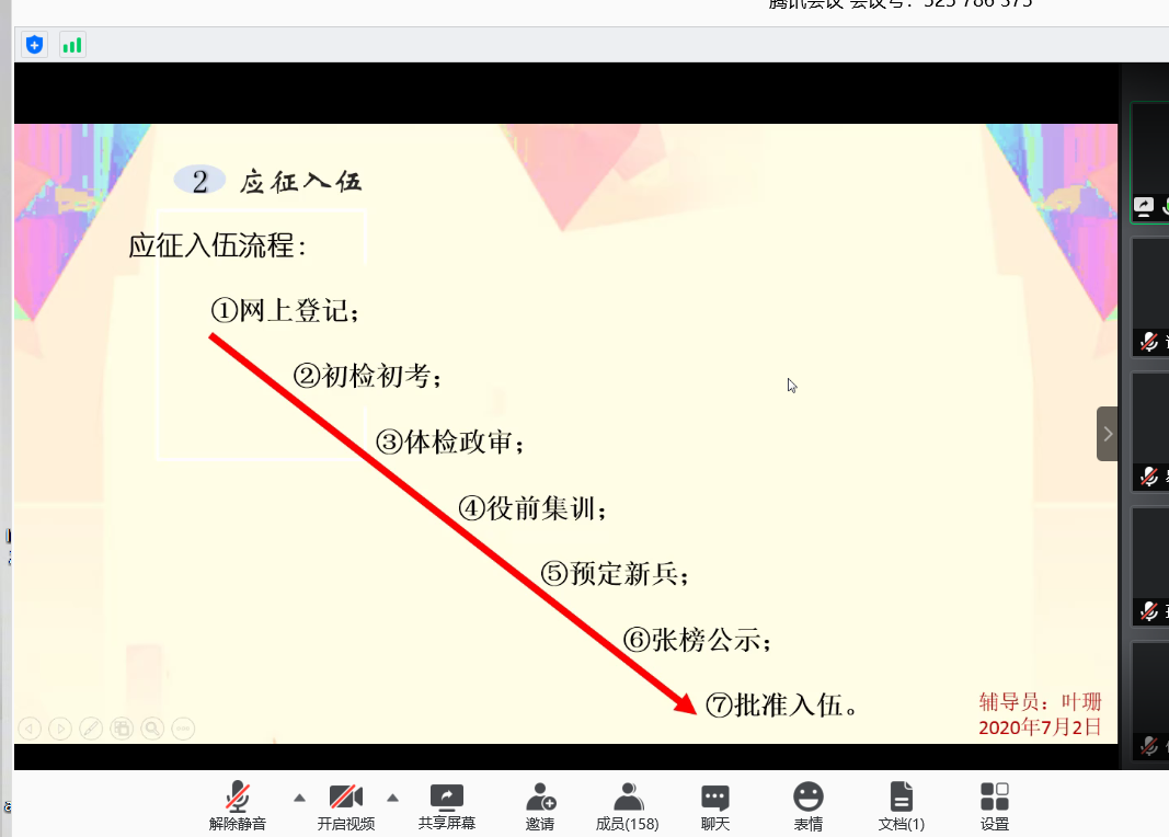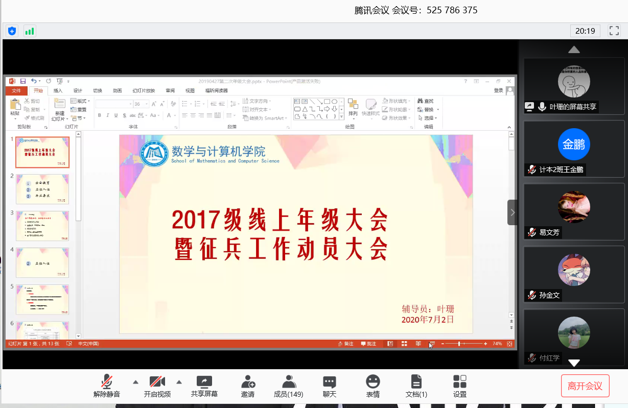 本报讯(王金鹏 报道)2020年7月2日19:00,2017级计算机科学与技术、网络工程全体同学在腾讯会议app召开线上征兵宣传主题会议,会议由2017级辅导员叶珊老师主持。