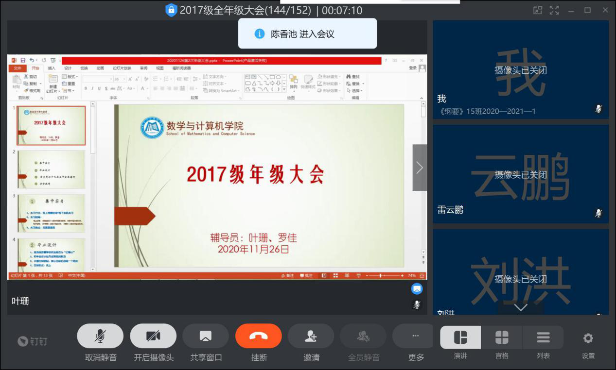 会议伊始,叶珊向同学们介绍本次动员大会流程。随后,叶珊告知同学们实习方式、时间、地点,同时罗佳解答实习费用、住行等问题。其次,叶珊对毕业设计进行说明,要求同学们对选题难度、审核状态再次确认,并且主动找指导老师沟通,保持联系,以及对答辩进行准备。最后,叶珊、罗佳在线上解答同学们实习问题,鼓励同学们在实习中提高自己,取得优秀成果。